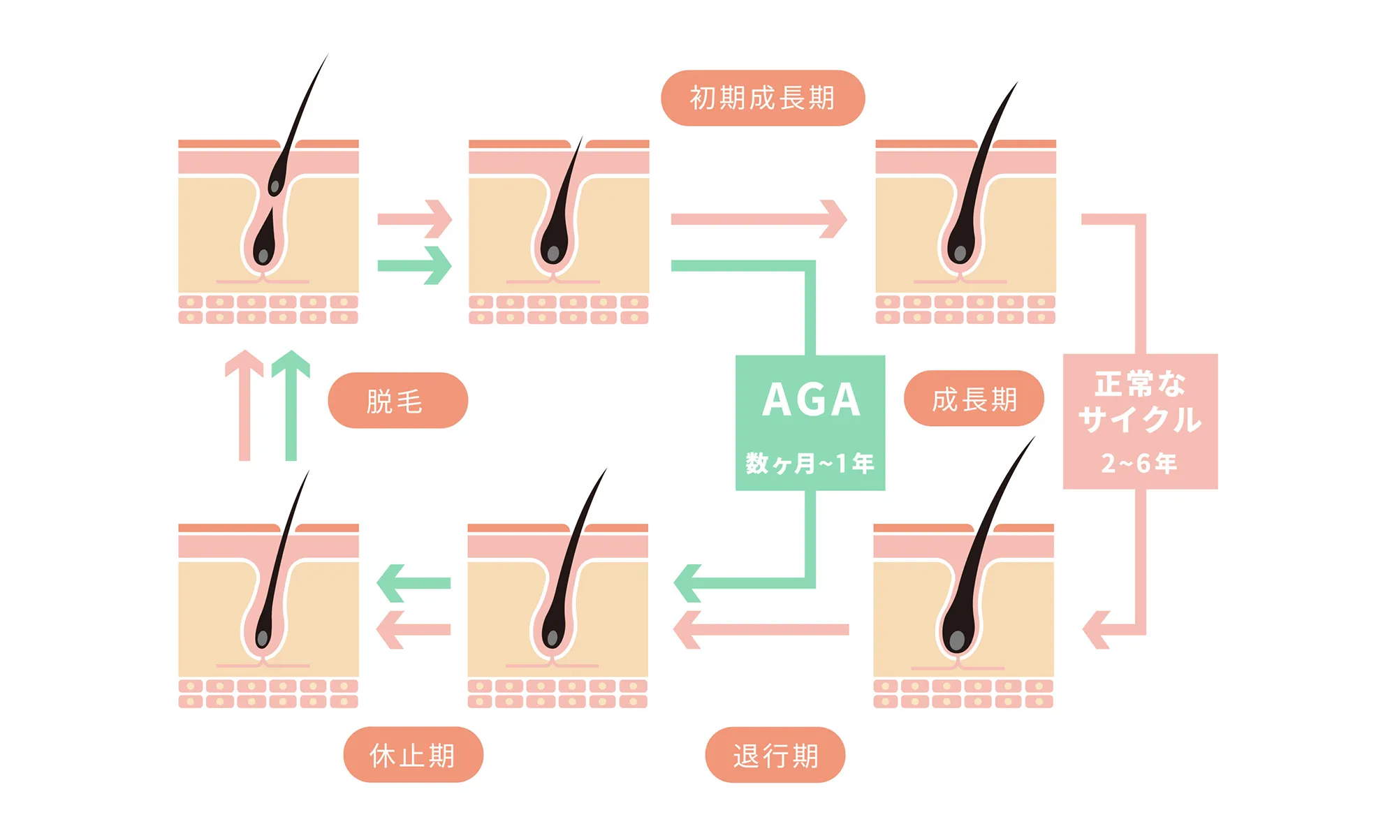 AGAの主な原因は、男性ホルモンであるテストステロンが5α還元酵素により変換されて生成される「ジヒドロテストステロン(DHT)」の影響です。DHTは毛包に作用し、髪の成長期を短縮させてしまうため、髪が十分に太く長く成長する前に抜けてしまいます。その結果、髪は細く弱々しくなり、薄毛が進行します。またAGAは遺伝的要因も大きく、家族に同様の症状がある場合は発症しやすい傾向があります。生活習慣やストレスも悪化要因となることがあります。原因を理解することで適切な治療薬や方法を選択でき、進行抑制や改善が期待できます。