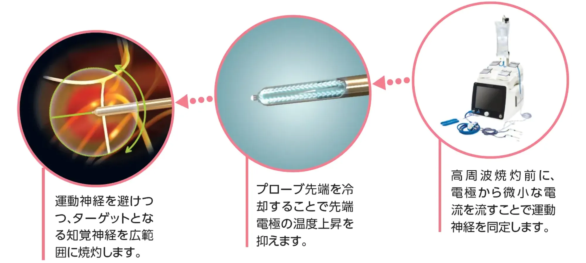 感覚神経(痛みを感じる神経)に対して高周波(ラジオ波と呼ばれる電磁波)を流し、感覚神経を部分的に焼灼(しょうしゃく:組織を焼いて破壊する外科的治療法)して痛みを軽減します。従来の高周波治療より効果が持続しやすく、関節痛や腰痛、変形性関節症などの治療効果が期待されます。治療は局所麻酔下で行われ、日帰りでの実施が可能なため、入院や長期休養の必要がありません。痛み止め薬の使用量を減らすことが期待でき、生活の質(QOL)の向上につながります。