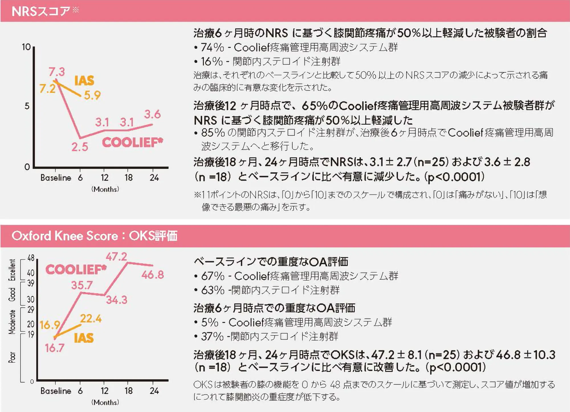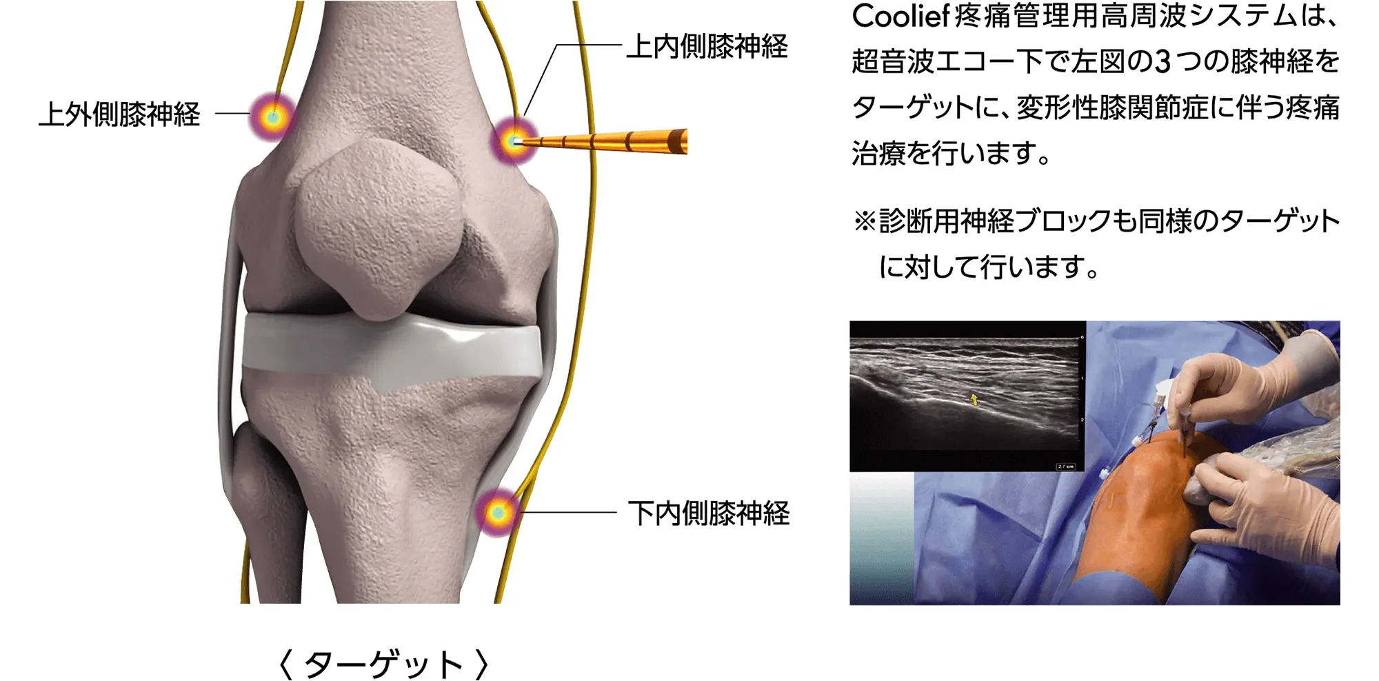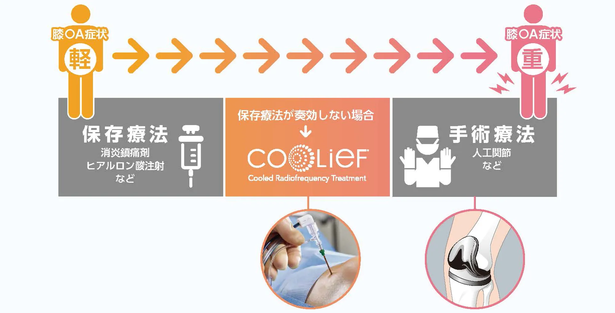 Coolief(クーリーフ)疼痛管理用高周波システム【ラジオ波治療】は、変形性膝関節症(膝OA)の内、人工関節などの手術療法には至らないが、既存のヒアルロン酸注射などの保存療法では疼痛を十分管理できない患者様の選択肢となる新しい治療法です。